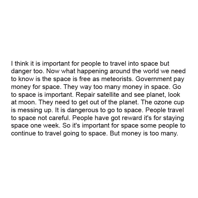 I think it is important for people to travel into space but danger too. Now what happening around the world we need to know is the space is free as meteorists. Government pay money for space. They way too many money in space. Go to space is important. Repair satellite and see planet, look at moon. They need to get out of the planet. The ozone cup is messing up. It is dangerous to go to space. People travel to space not careful. People have got reward it’s for staying space one week. So it’s important for space some people to continue to travel going to space. But money is too many.