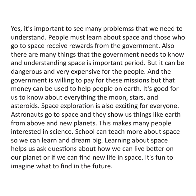 Yes, it’s important to see many problemss that we need to understand. People must learn about space and those who go to space receive rewards from the government. Also there are many things that the government needs to know and understanding space is important period. But it can be dangerous and very expensive for the people. And the government is willing to pay for these missions but that money can be used to help people on earth. It’s good for us to know about everything the moon, stars, and asteroids. Space exploration is also exciting for everyone. Astronauts go to space and they show us things like earth from above and new planets. This makes many people interested in science. School can teach more about space so we can learn and dream big. Learning about space helps us ask questions about how we can live better on our planet or if we can find new life in space. It’s fun to imagine what to find in the future.
