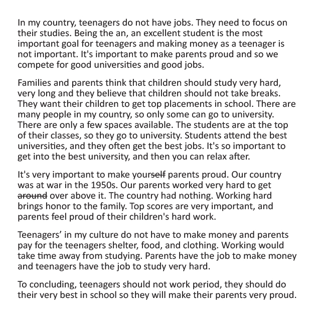In my country, teenagers do not have jobs. They need to focus on their studies. Being the an, an excellent student is the most important goal for teenagers and making money as a teenager is not important. It’s important to make parents proud and so we compete for good universities and good jobs.