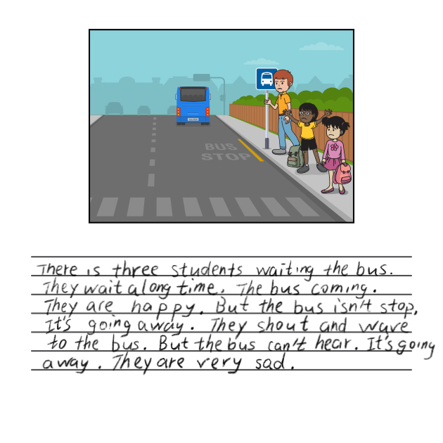 There is three students waiting the bus. They wait a long time. The bus coming. They are happy. But the bus isn’t stop. It’s going away. They shout and wave to the bus. But the bus can’t hear. It’s going away. They are very sad.