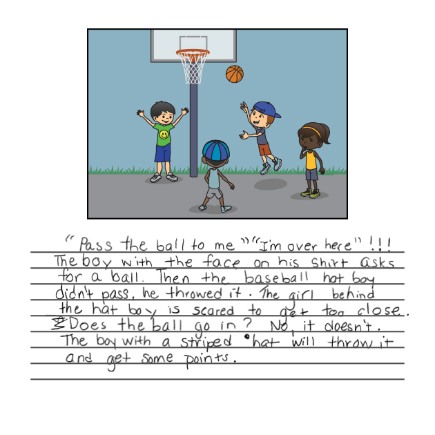 “Pass the ball to me” “I’m over here”!!! The boy with the face on his shirt asks for a ball. Then the baseball hat boy didn’t pass, he throwed it. The girl behind the hat boy is scared to get too close. Does the ball go in? No, it doesn’t. The boy with a striped hat will throw it and get some points.