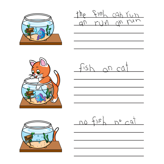 Level A: Uses survival words (run, no), basic utility words (the, fish, cat, can), and social greetings (-)