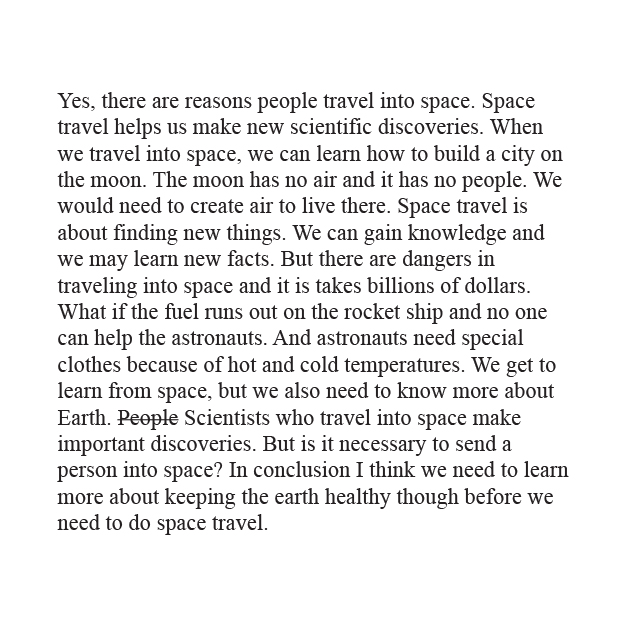 Yes, there are reasons people travel into space. Space travel helps us make new scientific discoveries. When we travel into space, we can learn how to build a city on the moon. The moon has no air and it has no people. We would need to create air to live there. Space travel is about finding new things. We can gain knowledge and we may learn new facts. But there are dangers in traveling into space and it is takes billions of dollars. What if the fuel runs out on the rocket ship and no one can help the astronauts. And astronauts need special clothes because of hot and cold temperatures. We get to learn from space, but we also need to know more about Earth. People Scientists who travel into space make important discoveries. But is it necessary to send a person into space? In conclusion I think we need to learn more about keeping the earth healthy though before we need to do space travel.
