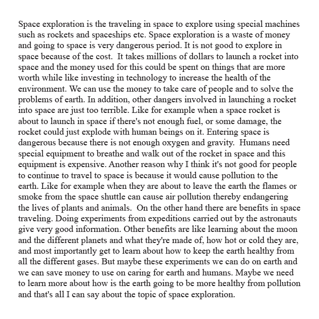 Space exploration is the traveling in space to explore using special machines such as rockets and spaceships etc. Space exploration is a waste of money and going to space is very dangerous period. It is not good to explore in space because of the cost. It takes millions of dollars to launch a rocket into space and the money used for this could be spent on things that are more worth while like investing in technology to increase the health of the environment. We can use the money to take care of people and to solve the problems of earth. In addition, other dangers involved in launching a rocket into space are just too terrible. Like for example when a space rocket is about to launch in space if there’s not enough fuel, or some damage, the rocket could just explode with human beings on it. Entering space is dangerous because there is not enough oxygen and gravity. Humans need special equipment to breathe and walk out of the rocket in space and this equipment is expensive. Another reason why I think it’s not good for people to continue to travel to space is because it would cause pollution to the earth. Like for example when they are about to leave the earth the flames or smoke from the space shuttle can cause air pollution thereby endangering the lives of plants and animals. On the other hand there are benefits in space traveling. Doing experiments from expeditions carried out by the astronauts give very good information. Other benefits are like learning about the moon and the different planets and what they’re made of, how hot or cold they are, and most importantly get to learn about how to keep the earth healthy from all the different gases. But maybe these experiments we can do on earth and we can save money to use on caring for earth and humans. Maybe we need to learn more about how is the earth going to be more healthy from pollution and that’s all I can say about the topic of space exploration.