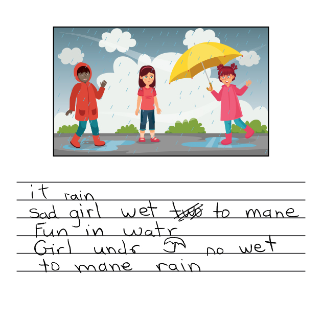 Level B: Uses a few high-frequency utility words (it, watr [water], no), familiar words (rain, girl, wet, mane [many], fun), and social greetings (sad)