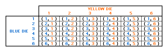 If each face on the yellow die is represented by a yellow numeral of the number of dots on the face, and each face on the blue die is represented by a blue numeral of the number of dots on the face; the following represents all of the outcomes: