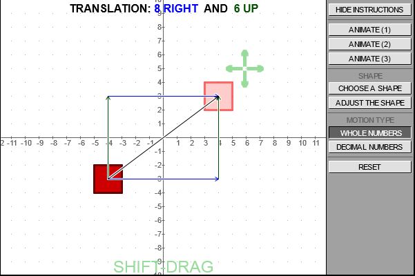 A translation is a transformation in geometry in which an object is moved in a straight line without turning or changing the size or shape. Every point of an object is moved the same distance and in the same direction. A translation arrow indicates the direction and amount of movement.